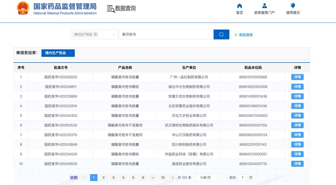 2002年,达菲在中国获批上市,并享有长达14年的专利保护期。2016年,随着达菲专利到期,国内的奥司他韦仿制药如雨后春笋般涌出。中国新闻周刊检索国家药监局官网发现,截至发稿,包含“奥司他韦”关键字的境内生产药品共123条结果,生产单位中不乏一品红、华润三九、吉林敖东等知名企业。