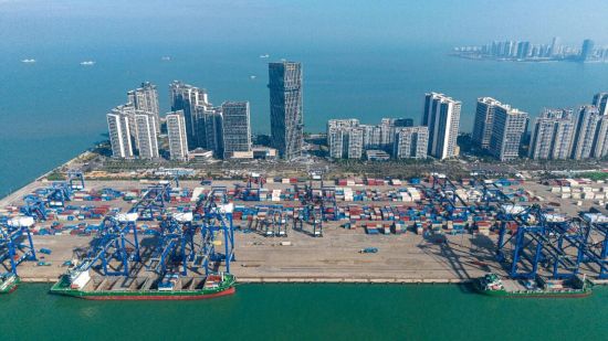 鸟瞰海南省海口港集装箱码头。图/中新社发 蒙钟德 摄