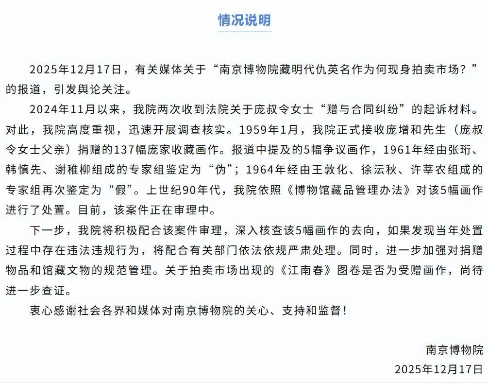 对此,12月17日晚,南京博物院发布情况说明:2024年11月以来,该院两次收到法院关于庞叔令女士“赠与合同纠纷”的起诉材料。经核查,1959年1月,该院正式接收庞增和先生(庞叔令女士父亲)捐赠的137幅庞家收藏画作。报道中提及的5幅争议画作,1961年经由张珩、韩慎先、谢稚柳组成的专家组鉴定为“伪”;1964年经由王敦化、徐沄秋、许莘农组成的专家组再次鉴定为“假”。上世纪90年代,该院依照《博物馆藏品管理办法》对该5幅画作进行了处置。目前,该案件正在审理中。