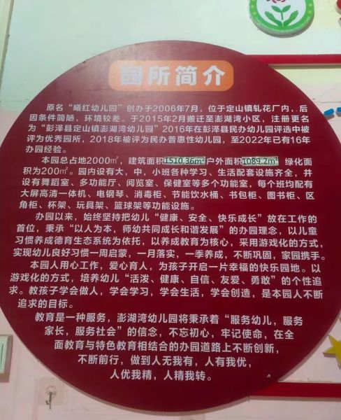 据了解,涉事幼儿园是彭泽县定山镇的澎湖湾幼儿园,这是一家民办幼儿园。网传幼儿园内张贴的一张简介显示,澎湖湾幼儿园2015年搬到澎湖湾小区,总占地2000平方米,园内设有大、中、小班,2016年在县民办幼儿园评选中,被评为优秀园所,2018年被评为民办普惠性幼儿园。