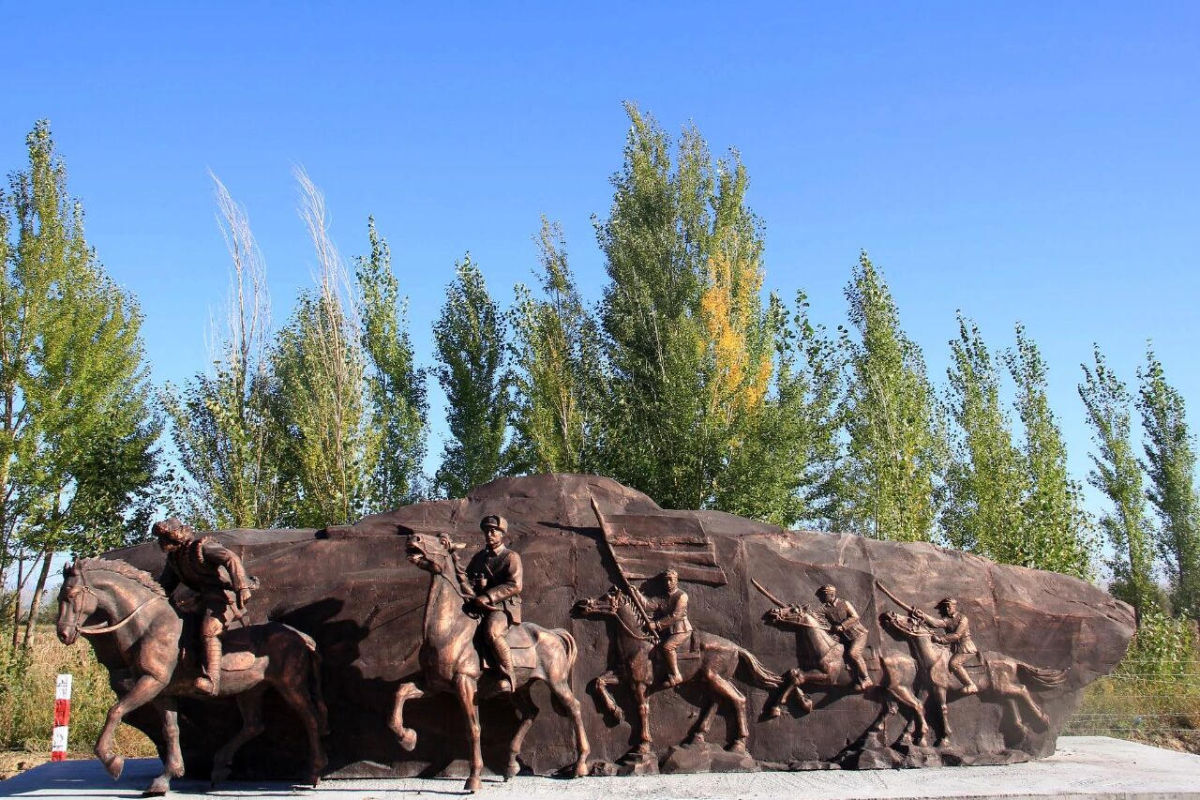 在进入一八一团的道路旁,一组名为“五人策马风驰电掣”的雕像中,解放军官兵高举红旗,冲在最前方的哈萨克族青年的原型,就是胡拥军的父亲胡达拜尔干。