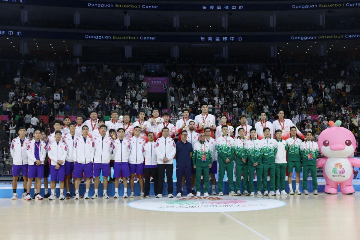12日晚,广东队夺得十五运男篮成年组冠军。赛后,广东队主动邀请香港队和澳门队一同合影。镜头前,三地球员站成整齐队列,广东队的红、香港队的蓝与澳门队的绿,三色领奖服交相辉映。