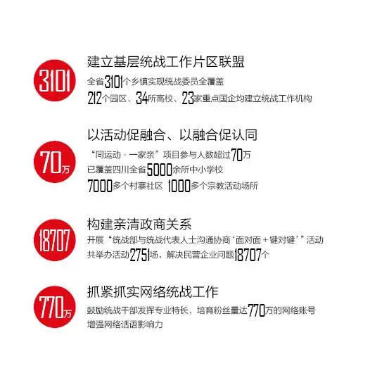 在基层统战方面,四川创建基层统战工作片区联盟,推动社区、园区、高校、国企等切实履行统战职责,全省3101个乡镇实现统战委员全覆盖,212个园区、34所高校、23家重点国企均建立统战工作机构。