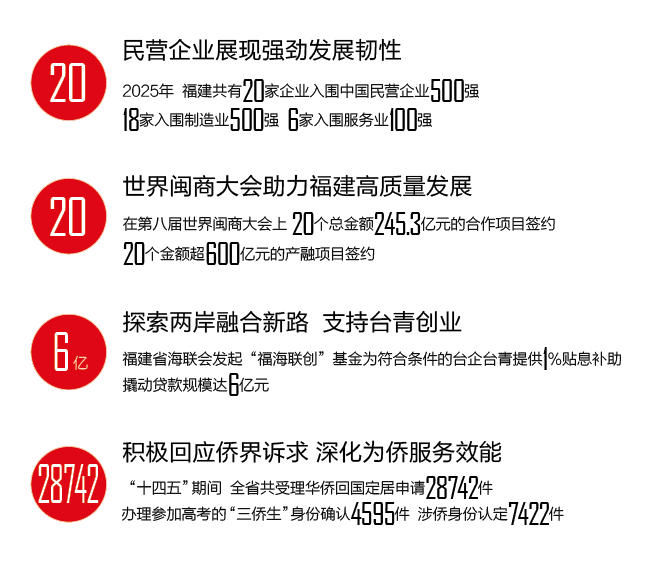 每三年一度的世界闽商大会,成为弘扬闽商精神、汇聚闽商力量、促进对外开放、加强联谊交友和招商引资、项目对接,推进福建高质量发展的重要平台。2025年6月于福州举行的第八届世界闽商大会上,来自95个国家和地区的1600余名闽商代表和各界人士齐聚,叙乡情、话合作。95位优秀企业家受到“福建省非公有制经济优秀建设者”的表彰,15家海内外新生代商会组织签订《友好合作协议》,20个总金额245.3亿元的合作项目在福建省招商引资推介会上签约,20个签约金额超600亿元的产融项目在福建金融赋能新质生产力发展对接会上签约。