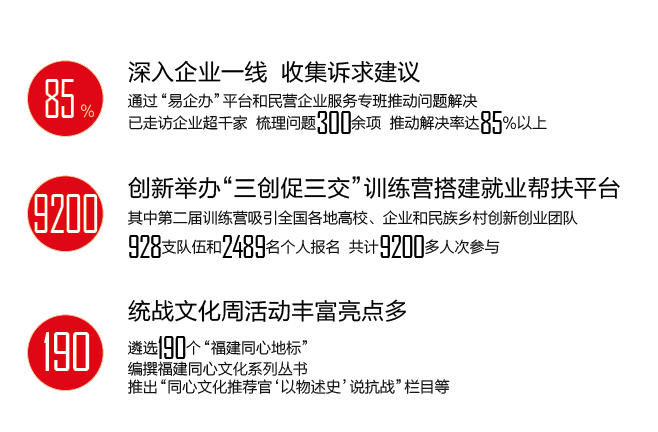 近年来,福建完善“统战部+纪检组+工商联”三方协同机制,统战部专注思想引领,纪检组专注监督保障,工商联专注服务实施,同向聚焦、同心聚力,深入企业一线,收集诉求建议,通过“易企办”平台和民营企业服务专班,推动问题解决。截至目前,已走访企业超千家,梳理问题300余项,推动解决率达85%以上。