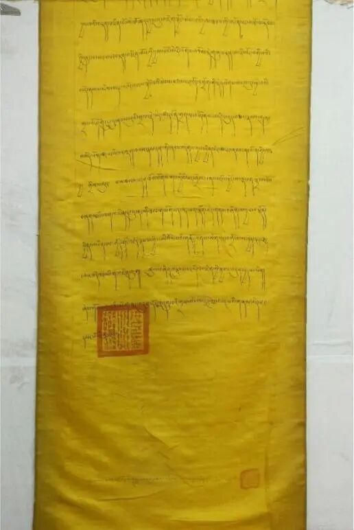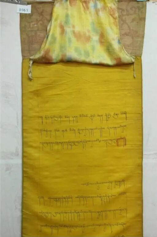 第四件文告发布于1698年(藏历土虎年)(图四),该文告是一件长达137厘米的黄色丝绸长卷,其起首格式同样具有重大政治意涵:“奉皇帝圣旨,在霍尔领土之上第六世达赖喇嘛金刚持颁布的法旨”。这句话言简意赅,却构成了一个完整的权力叙事闭环:皇帝的旨意是最高权威来源,达赖喇嘛的教令是在当时清朝管辖下的和硕特蒙古势力范围(霍尔领土)内行使。