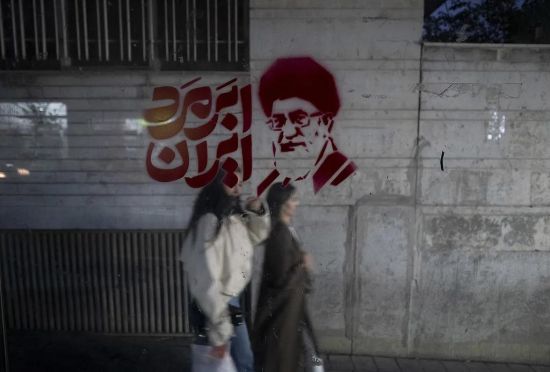当地时间2026年3月26日,伊朗德黑兰,两名年轻伊朗女性走过已故最高领袖阿里·哈梅内伊的画像。图/视觉中国
