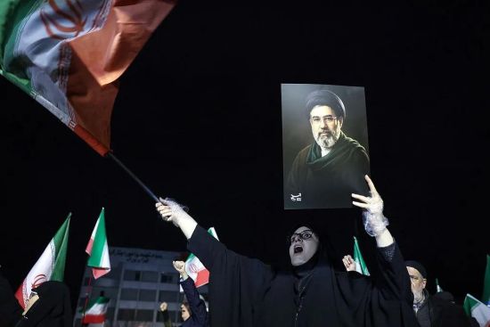 当地时间2026年3月25日,伊朗德黑兰市中心的游行中,一名女子手持伊朗最高领袖穆杰塔巴的肖像。图/视觉中国