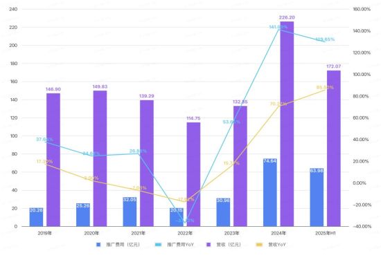 2019年至2025年上半年,世纪华通推广费用与营收情况。图/中国新闻周刊整理自财报
