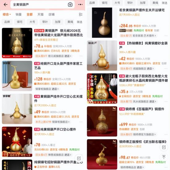 但中国新闻周刊观察到,以铜葫芦相关产品为例,在线上购物平台还包括朱炳仁、铜欣祥、铜满满、观铜、铜掌柜、风水阁、缤越、瑞念、百纳缘等近30个品牌拥有同品类产品,这还不算各类铜器批发、手作类店铺。而从详情页来看,这些产品差距并不算特别明显。