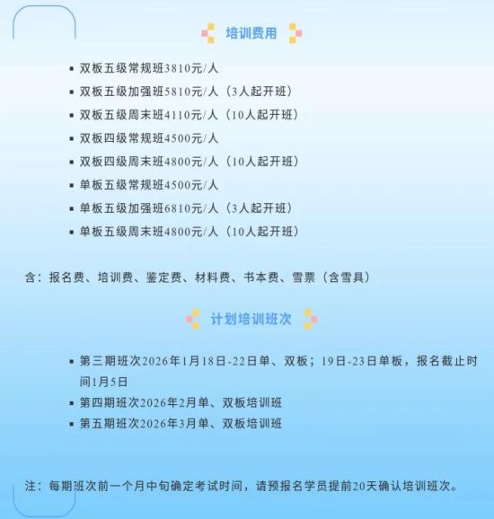 关于考核,该工作人员表示,最终都是标准化考核,只要达标就能都通过,如双板考核项为犁式转弯和平行回转,单板则为基础S弯和双脚直跳。