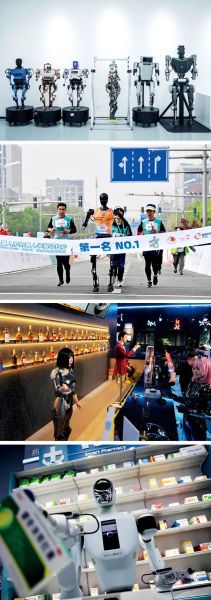 2025年4月19日,2025北京亦庄半程马拉松暨人形机器人半程马拉松现场,天工队选手天工Ultra(左二)在比赛中冲向终点。图/新华