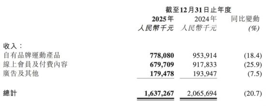 但变现效率的提升,难以抵消用户规模下滑的影响。去年,Keep自有品牌运动产品、线上会员及付费内容、广告及其他三大业务的营收分别同比下滑18.4%、25.9%、7.5%,呈现全线收缩。