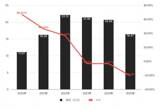其中,去年营收下滑幅度更是远超2023年和2024年的约3%,达到了20.74%。