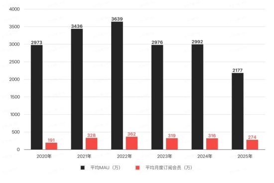 同时,其平均月度订阅会员也从2024年的316万收缩至去年的274万。这意味着,其核心付费人群也在同步缩小。