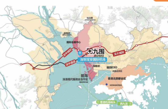 九围总部位于深圳宝安区航城街道,背靠凤凰山,面朝铁岗水库,距离深圳国际机场仅5公里,紧邻前海深港现代服务业合作区,处于深中通道与湾区新轴线的“T”字形交汇处,是大湾区唯一同时拥有“空港+海港+高铁+城际”的复合交通枢纽区域。这一区位优势使其成为连接珠江东岸与西岸的“桥头堡”,以及深圳向湾发展的前沿阵地。