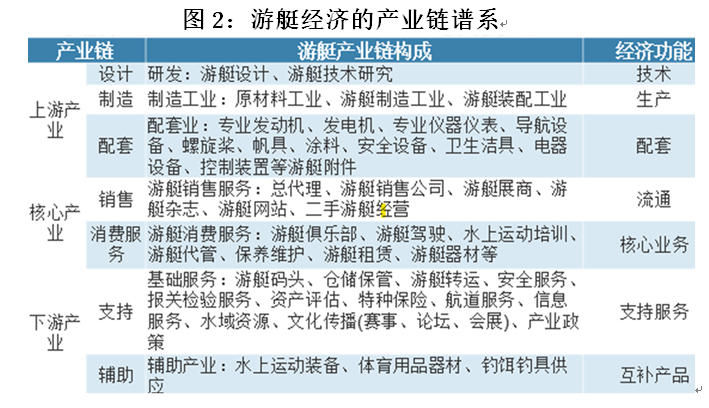 发展游艇经济是推动不同产业融合发展的典型领域。游艇经济涵盖游艇设计、制造、销售、俱乐部休闲旅游、维护保养等环节,同时带动码头建设、水上活动运营、游艇会展、救援运输、零配件制造、保险、教育培训及餐饮娱乐等行业发展,形成一条上、中、下游紧密衔接的产业链条。游艇经济上游的设计与制造、中游的销售与消费、下游的配套与服务之间,存在很强的联动性。