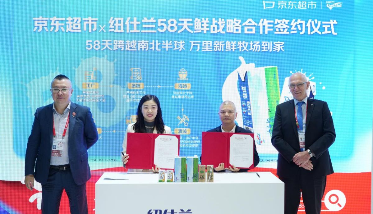 在第八届中国国际进口博览会盛大舞台上,京东超市与新西兰知名乳业纽仕兰接连举行两场战略合作签约仪式,标志着双方合作迈向全链路优化与多场景覆盖的新阶段。这两项签约既聚焦于打造"58天鲜"的极致供应链效率,又致力于推出系列化定制新品,共同满足中国消费者对进口乳品"新鲜直达、优质多样"的核心需求。