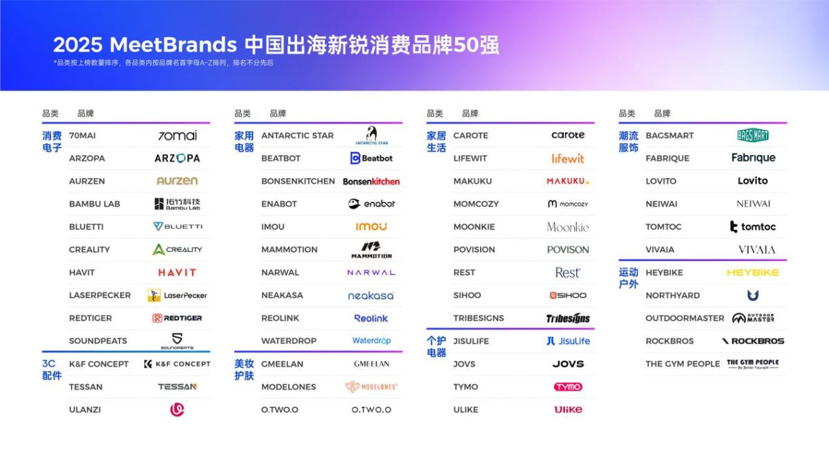 飞书点跃BeyondClick推出「MeetBrands中国出海新锐消费品牌榜」的意义也正在于此,它不仅是一次排名,更像是一张“出海能力地图”。当行业进入深水区,那些真正能穿越周期的品牌,往往不是赌对了风口,而是把能力做成了惯性,把组织做成了复利。