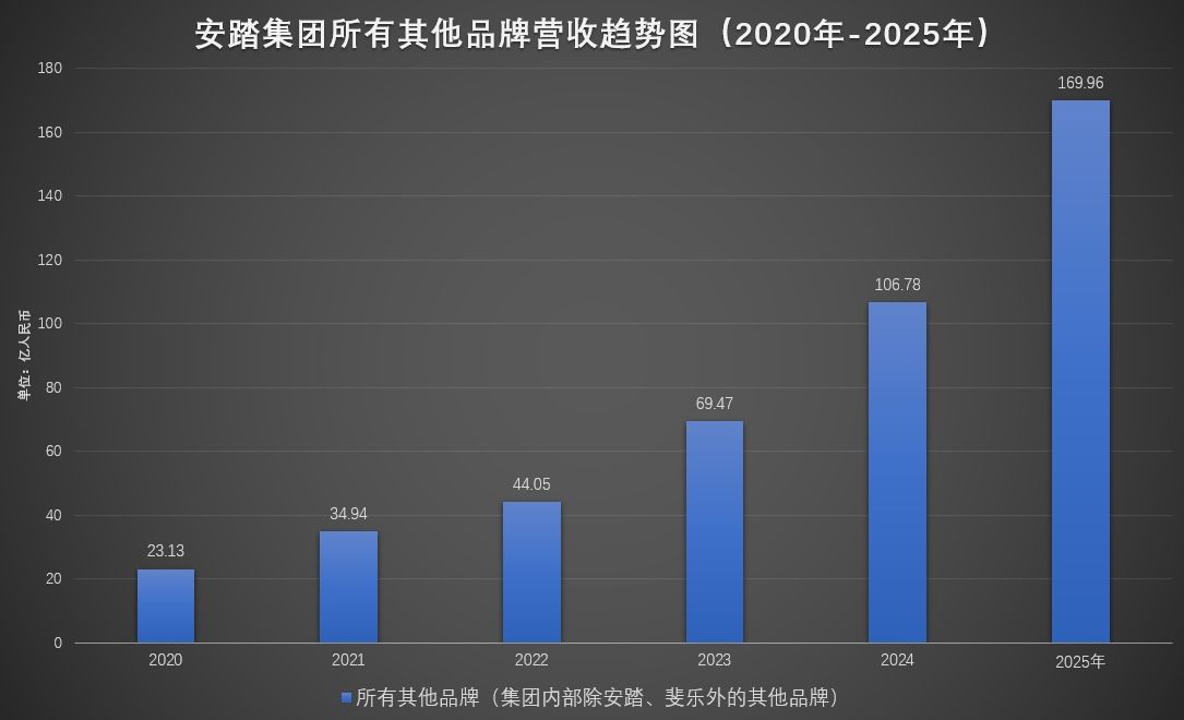 从2020年到2025年,安踏集团“所有其他品牌”总营收从23.13亿元增长至169.96亿元,总增长超过500%,显示出多品牌战略的巨大潜力。
