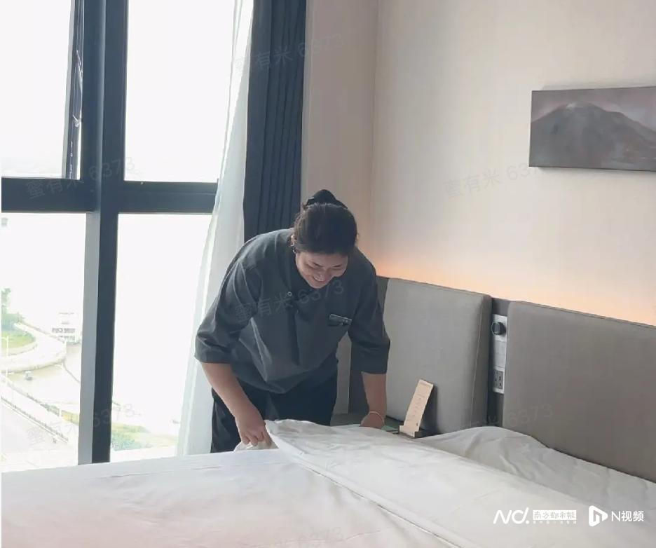 采访结束的下午,云唐正在打扫一间退房。门开着,她戴上手套弯下腰清理好垃圾桶,然后扔掉并换上新的一次性手套,麻利地移动百来斤重的床垫,铺上新的床单,一个人扯被套,四个角对齐。7分钟过去了,做完这些后,她把房间里的开水壶装满水,烧开消毒。