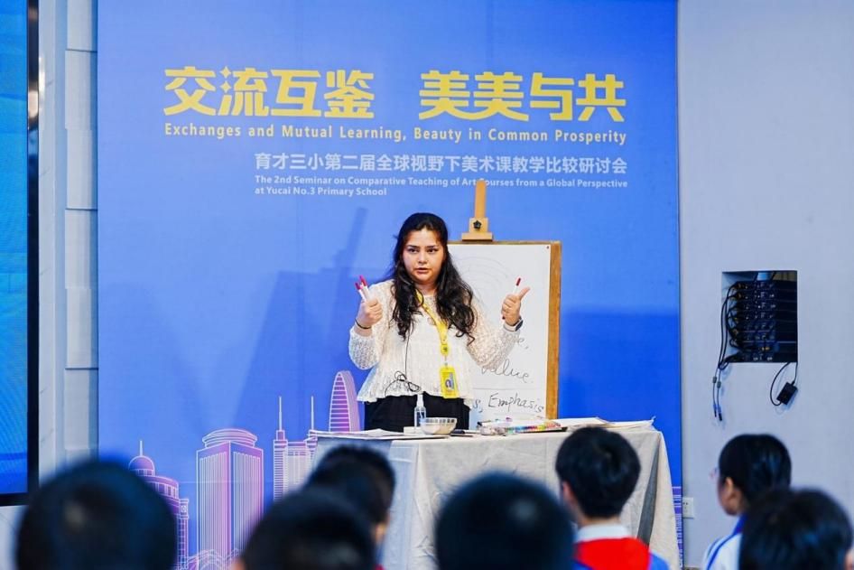 然而,其使命远不止于校园围墙之内。当这套绘本被赠予SJS深圳日本人外籍人员子女学校、爱文国际学校、蛇口外籍人员子女学校、QSI深圳市科爱赛外籍人员子女学校等多所国际姊妹学校时,它的属性便从“校本教材”扩展为“国际礼物”。这份礼物承载着双重邀请:一是邀请国际师生通过绘本“云游”南山,理解深圳;二是展示中国基础教育在文化传承与创新上的主动探索。第二届全球视野下美术课教学比较研讨会上,“让优秀传统文化在孩子们手中‘活’起来、‘新’起来”的呼吁,在绘本中得到了实践 ——传统并非静止的展品,而是可被描绘、讲述和分享的流动叙事。
