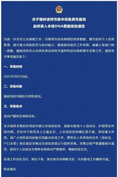 9月20日,内蒙古自治区锡林浩特市公安局对外发布通告称,9月5日起,集中采集辖区内男性居民血样,录入本地DNA数据库。采集对于防范老人儿童走失、人员身份信息确认等方面,具有重大作用。采集地点在居民户籍所在地派出所。