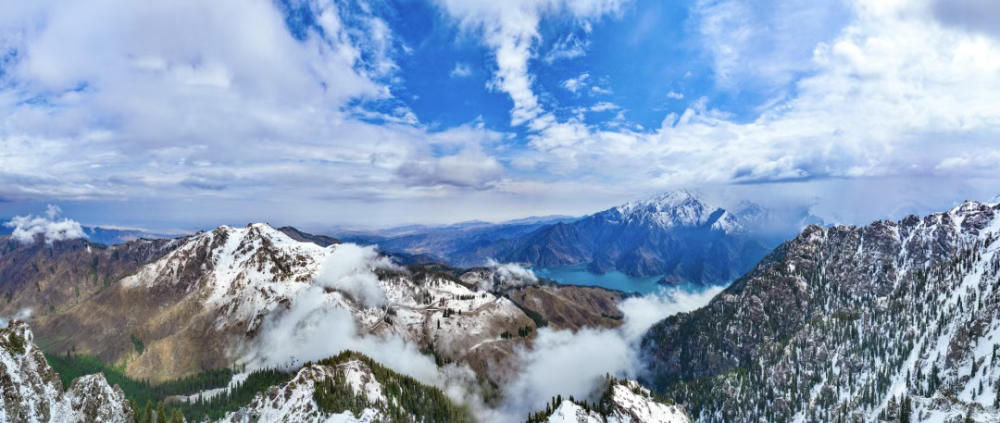 天山天池风光(无人机照片)。(昌吉回族自治州融媒体中心记者 何龙 摄)