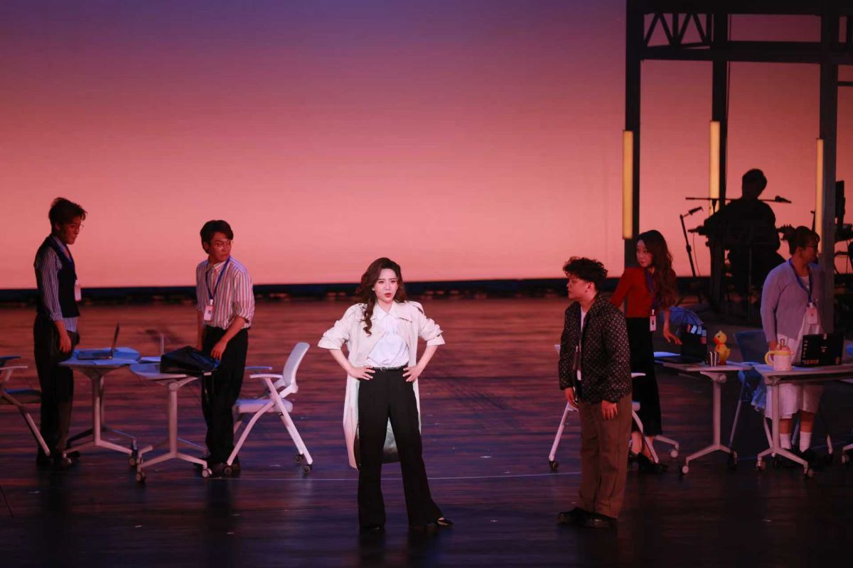 大幕拉开,舞台上再现了熟悉的职场场景——时钟指向下班时刻,员工们蠢蠢欲动。《星期五一定要准时下班》的旋律响起,轻快的节奏配上诙谐的歌词,瞬间引爆全场共鸣。当女主角张凯艺带着行李箱匆忙登场,严厉质询下属工作进度时,台下不少观众会心一笑,仿佛看到了自己的职场缩影。