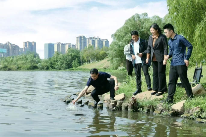 民建岳阳市委会民主监督小组在东风湖上湖区城镇雨洪排口监测点现场取样检测。 中共湖南省委统战部供图