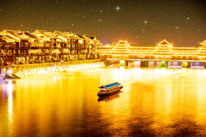夜幕降临,华灯初上,各种奇幻的灯光场景在湖南怀化芷江侗族自治县和平湖两岸轮番上演,龙津风雨桥、天后宫、鼓楼、侗寨等民族元素在光影的映衬下,焕发出新的魅力。