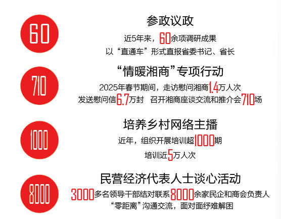 从粤港澳大湾区到雪峰山麓,从跨国企业到乡村车间……中共湖南省委统战部、省工商联实施“情暖湘商”大走访大慰问大招商专项行动,2025年春节期间,湖南省各市(州)、县(市区)共计走访慰问湘商1.4万人次,发送慰问信6.7万封,召开湘商座谈交流和推介会710场,将省委、省政府的温暖关怀和政策部署送进企业家心坎。