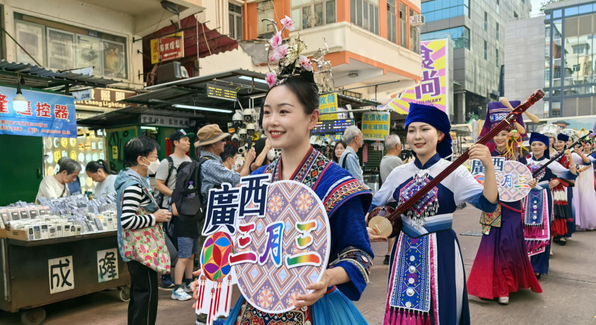 2025年4月13日至17日,“广西三月三”走进港澳系列活动举办。图为“广西三月三”快闪进香港深水埗,与香港市民互动。“十四五”时期,广西牢牢把握铸牢中华民族共同体意识工作主线,充分发挥统一战线强大法宝作用,坚持实干为要、创新为魂,用业绩说话、让人民评价,为奋力谱写中国式现代化广西篇章凝聚人心、汇聚力量。