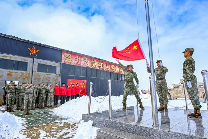 “大国边疆”育人工程实践团成员赴西藏日喀则市开展思政调研,走进“高原戍边模范营”哨所,与官兵共同举行升旗仪式。中国人民大学供图