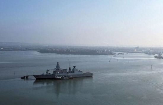 当地时间2026年3月4日,英国皇家海军45型勇敢级防空驱逐舰“龙”号停泊在朴茨茅斯海军基地外,准备派往塞浦路斯英军基地。图/视觉中国