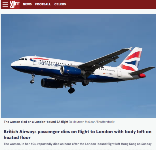 据媒体报道,近期,英国航空执飞的从中国香港至伦敦希思罗机场的BA32次航班上发生一起乘客猝死事件。