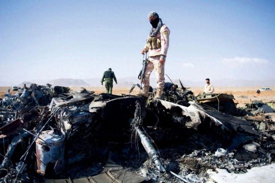 浓烟在被烧焦的飞机残骸上升起。从螺旋桨、引擎、机舱的形态,能依稀辨认出这是美军的C-130“大力神”运输机和“黑鹰”直升机。这次对美军飞行员的“生死营救”被美国总统特朗普称之为“史上最大胆、最勇敢的救援”。