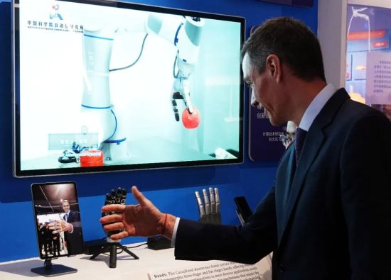 4月13日,桑切斯在中国科学院科技成就展具身智能展区参观体验。当日,西班牙首相桑切斯访问中国科学院,应邀参观中国科学院科技成就展,并接受中国科学院大学(国科大)名誉教授称号。图/中新